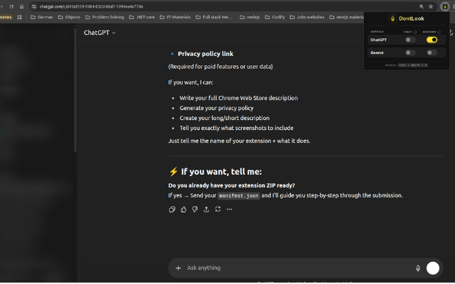 "🔒 DontLook – The #1 Privacy Extension for ChatGPT & Google Gemini Blur Chats, Hide History, Protect Your AI Workflow Instantly"